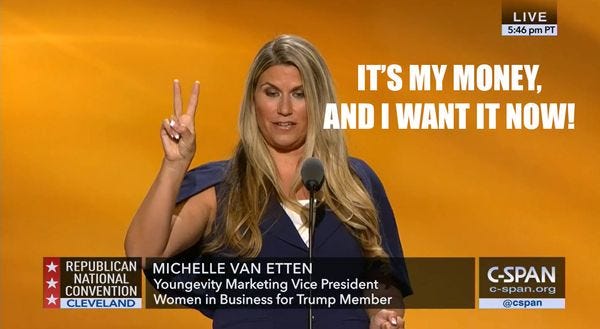 Although Michelle was described in RNC materials as an entrepreneur with over 100,000 employees... that's a little bit of an exaggeration. Though as anyone who has ever used Tinder or whatever can tell you -- so are most things about people who call themselves entrepreneurs. She doesn't actually have 100,000 employees, personally, she works for a multi-level marketing scheme that has maybe that many "independent contractors." She actually has zero employees, but whatevs!! So, basically she is like that chick you went to high school that keeps trying to sell you that Jamberry nail stuff all the damn time, except she hawks a brand called "Youngevity" that is also touted by fringe conspiracy theorist Alex Jones. NEAT! He says they make him extra Alex Jones-y, so you know they are probably full of meth.