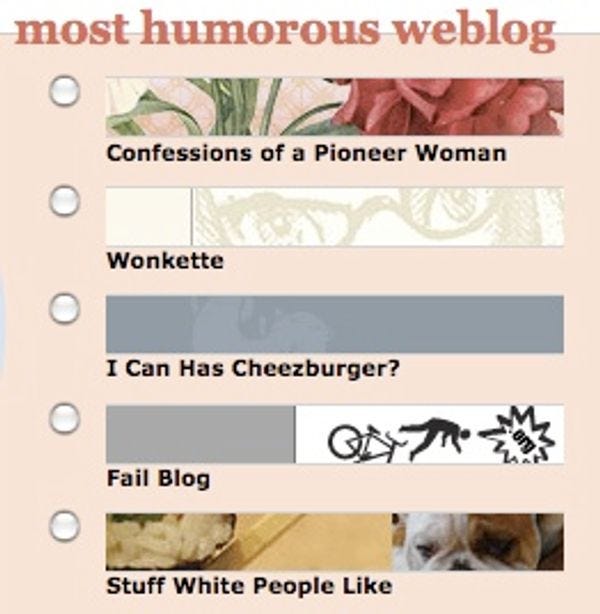 Well, enough of this navel-gazing bullshit. Vote for us, friends! And if you've got another favorite blog in the categories in which Wonkette is nominated, just findanothercategory where that favorite is also nominated, and vote for them over there.Example: If you like the fivethirtyeight.com, vote for Numberz Nate over in the Weblog of the Year category. If the LOLcats still make you laugh, vote for I Can Haz Cheezeburger in the Community Weblog category. So easy! We'll see you in Austin at the SXSW sex orgy, where these award winners will be announced during a blizzard of cocaine and neon dildos, for America.UPDATE: If you didn't get the verification email, you didn't vote.Go try again, please.