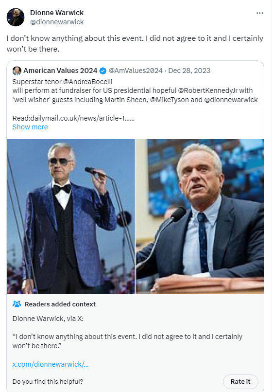 If 2024 is going to be full of people like Dionne Warwick publicly humiliating people like Robert F. Kennedy Jr. and the goons who suck on his pantlegs, we are here for it.