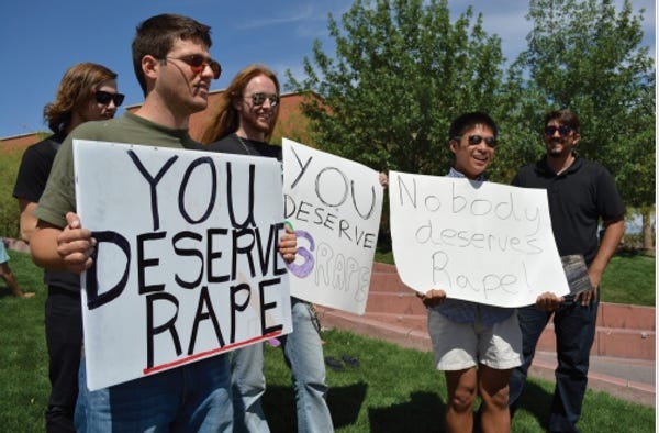 See it is the Daily Wildcat's fault for "giving this man attention" and for not putting a "trigger warning" because some survivors might see an offensive sign. Also, newspapers and weblogs should ignore him and Glenn Beck and anybody else who is crazy, because that is the job of the news, to ignore stuff we don't like.
