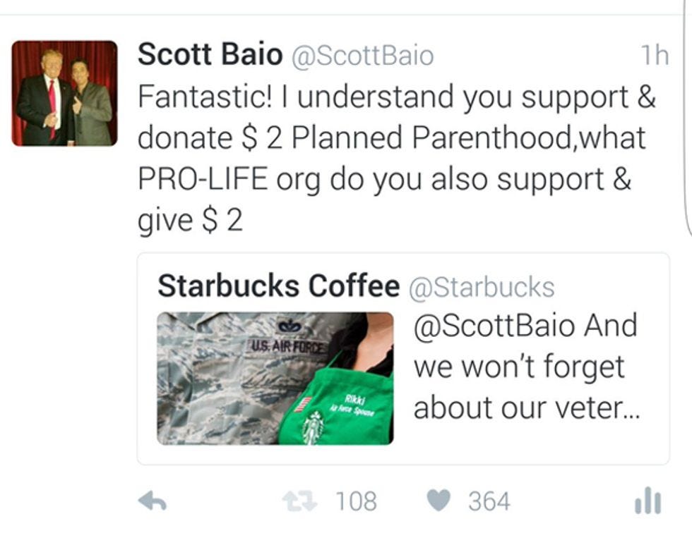 Oh, but those damned liberals didn't fool Scott Baio, not one bit, because he happens to know they're total hypocrites, like all liberals are. Sure, Starbucks may help vets and minorities like he originally asked about, but WHY IS STARBUCKS KILLING BABIES?