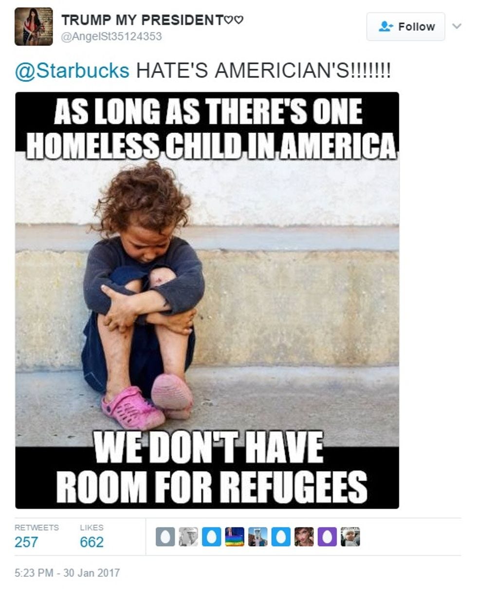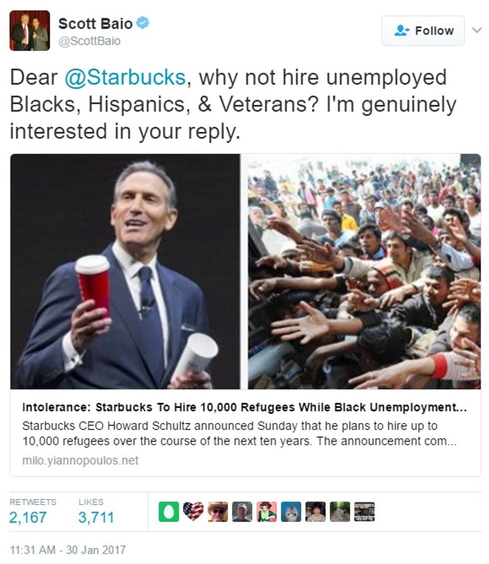 Not surprisingly, this was terribly offensive to Trump supporters, who promptly called for a boycott of the coffee chain they're already boycotting because of the Jesus-less coffee cups, the gun thing, and the company's very timid suggestion that Donald Trump is not a nice person. That'll show Starbucks, which has the gall to hire a bunch of filthy terrorists instead of veterans or The Inner-City People.