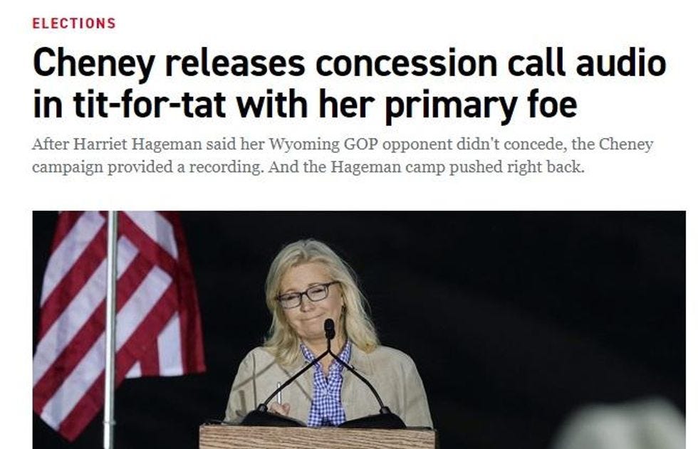 That headline, "Cheney releases concession call audio in tit-for-tat with her primary foe," really leans a little hard on the both-sidesism, suggesting that Cheney was somehow being every bit as petty as Hageman. You know how those Mean Girls can be! A follow-up story carried the more staid hed, "The Cheney concession receipts."