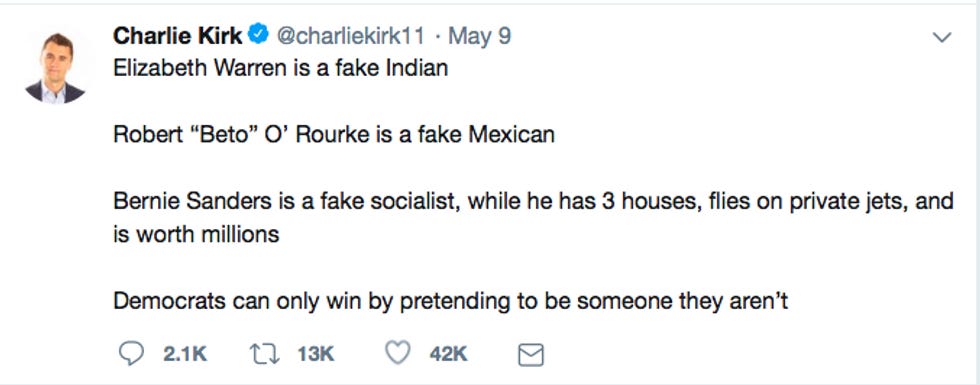 Turning Point USA can cut ties with the lowest hanging racist fruit, but its founder and president Charlie Kirk tweets garbage like this on the regular.