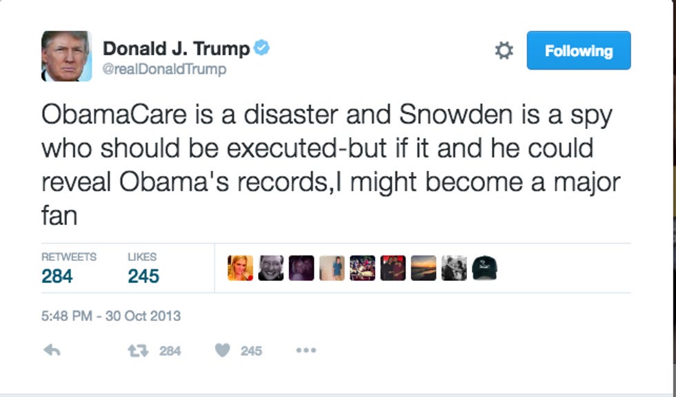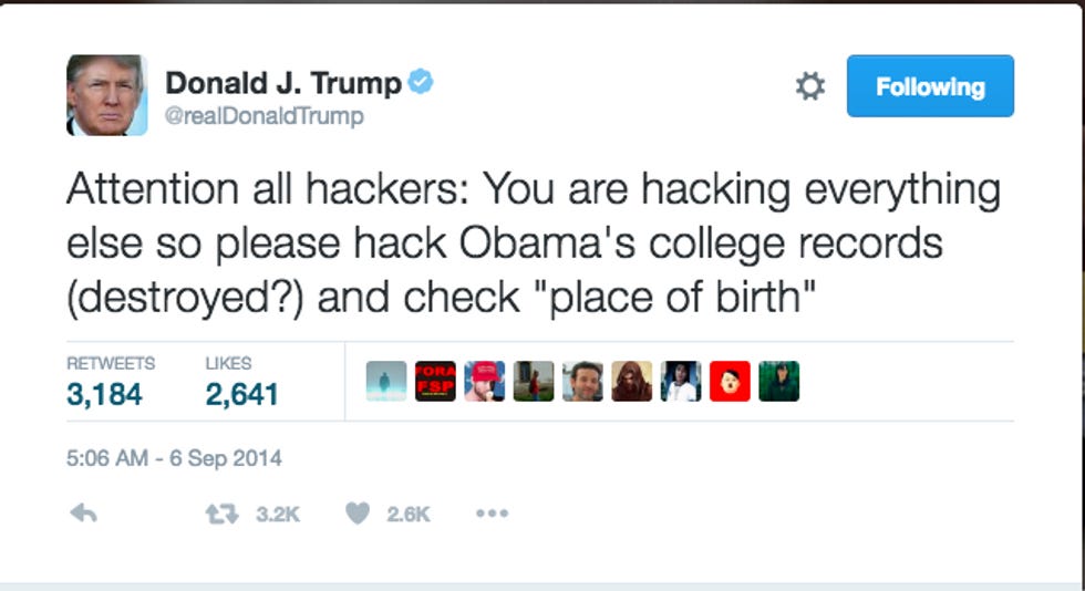 This is, unsurprisingly, not the first time Trump has asked for help from hackers! During his birther days, he repeatedly asked them to get him President Obama's records, so he could prove that he was born in Kenya, even though he wasn't.