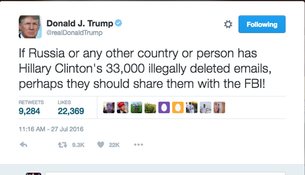 “Russia, if you’re listening, I hope you’re able to find the 30,000 emails that are missing. I think you will probably be rewarded mightily by our press.”