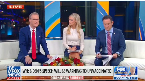 This morning, on "Fox & Friends," Ainsley Earhardt stand-in Carley Shimkus praised Trump’s bold pro-staying-alive position. She noted that about “74, 75 percent of Americans are at least partially vaccinated. That’s a high number.” Shimkus even said it was “fine” that President Joe Biden planned to encourage vaccinations. Then she shifted into anti-vax propaganda.