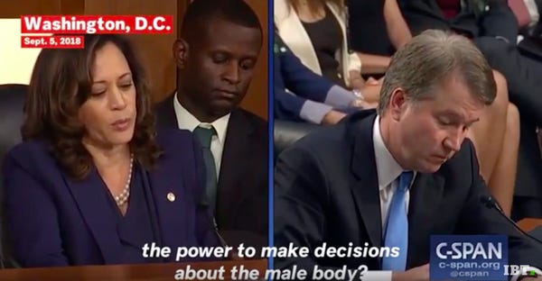 On Wednesday evening, Senator Kamala Harris asked Kavanaugh whether he knew of any instances in which the government controlled a man's body in the way the government would control women's bodies in the event that Roe were illegal.