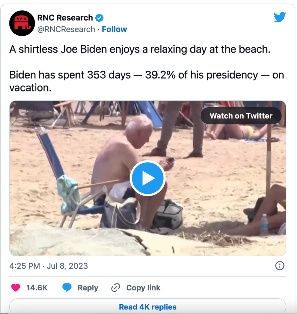 The caption reads with palpable irritation: "A shirtless Joe Biden enjoys a relaxing day at the beach. Biden has spent 353 days — 39.2 percent of his presidency — on vacation."