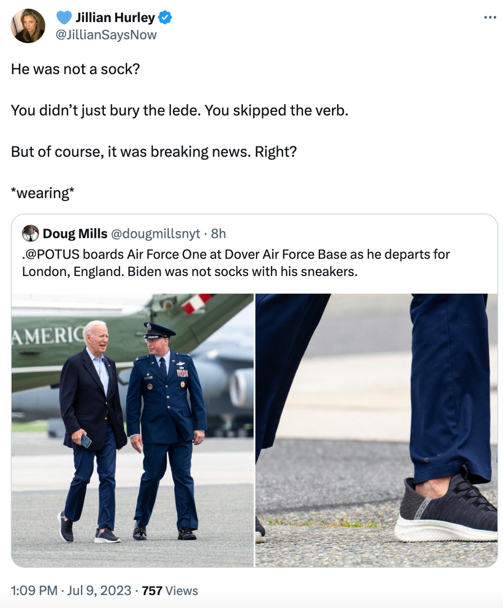 New York Times staff photographer Doug Mills shared a photo Sunday of Biden at Dover Air Force Base as the president prepared to leave for London. (That "vacation" was short-lived. He was already back to work.) Mills zoomed in to reveal that "Biden was not socks with his sneakers." I presume he meant that Biden was not *wearing* socks with his sneakers, but he was in such a rush to publish this relevant, breaking news that he couldn't waste time proofing his tweet.