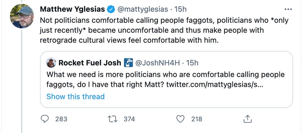 "Not politicians comfortable calling people faggots, politicians who *only just recently* became uncomfortable and thus make people with retrograde cultural views feel comfortable with him," Yglesias responded.
