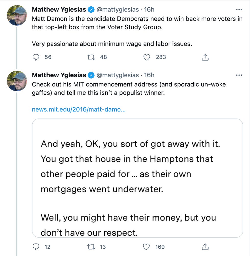 "Matt Damon is the candidate Democrats need to win back more voters in that top-left box from the Voter Study Group," Yglesias tweeted. "Very passionate about minimum wage and labor issues."