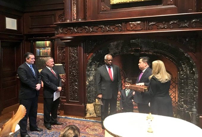 So technically legal (the best kind of legal) — just as there’s nothing illegal in James Ho being sworn in as a judge on the Fifth Circuit Court of Appeals at the home of Harlan Crow, the Texas billionaire GOP donor who collects Nazi memorabilia and Supreme Court justices. But kind of hinky-looking.