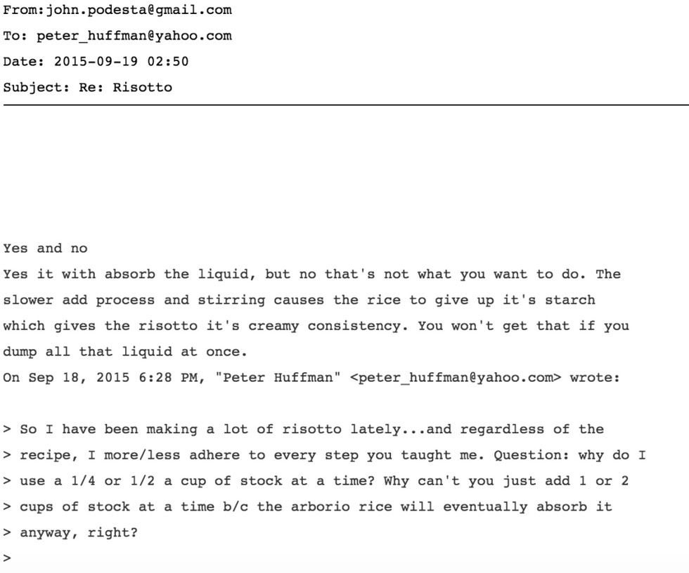 Listen up, chefs and wanna-be chefs. One of the OMGTERRIBLE emails released by WikiLeaks shows Clinton campaign chair John Podesta helping this guy Peter Huffman, whom Epicurious describes as "a Merrill Lynch financial adviser who's done work for the Clinton Foundation" (CORRUPTIONS!!!!111!), figure out how to make some damn risotto, and how to make it damn good. Huffman is like "but I don't WANNA pour the stock in gradually, I am too busy doing pay-to-play Benghazi with the Clinton Foundation," and Podesta is like "You have to do it that way, dumbhead! While you are slowly adding stock to achieve the perfect risotto, I will help Hillary do Whitewater to Vince Foster again."