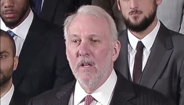 Gregg Popovich is the head coach of the San Antonio Spurs. Like many other sports people lo this past week, he has some things to say about Dear Leader's comments about all the sports men and why they shouldn't be allowed to have freedom of speech. Very good things to say, actually!