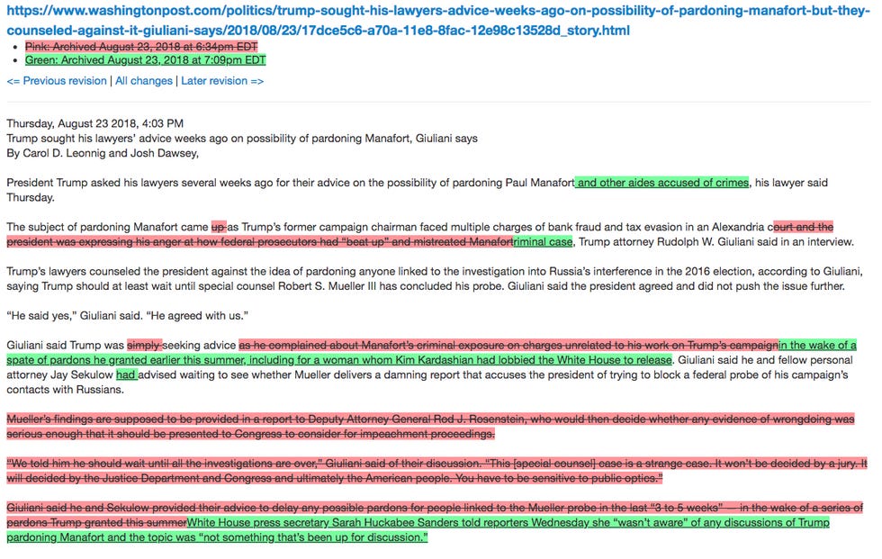 And suddenly the Washington Post story was amended to a general discussion of good people deserving of pardons, taking place long before the Manafort trial. Big hat tip to NYCSouthpaw (aka Luppe Luppen ), who laid it out in an epic Twitter thread. Here's how the story changed in the 40 minutes after publication.
