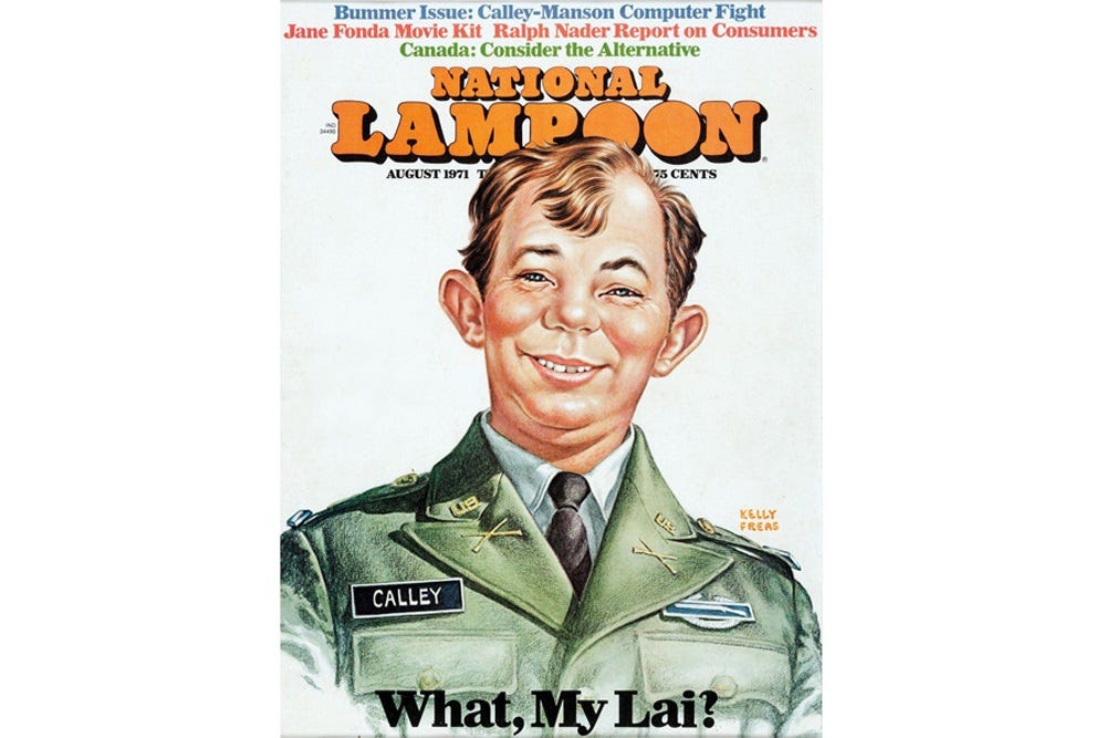 So that’s either a hell of a clerical error or the final act of a war criminal who knew exactly what he’d done; the obit notes Calley’s 2009 public “apology” in a speech to a Kiwanis Club meeting in Columbus, Ohio, perhaps the blandest possible forum for an infamous mass murderer to express regret for his actions.