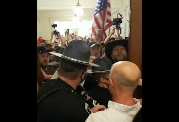 In Boise on Monday, on the first day of Idaho's special legislative session, access to the gallery in the state House of Representatives was limited, to allow for social distancing. Naturally, a crowd of mask-protesting idiots from the militia and anti-vaxxer groups wanted in, because they are bravely fighting for their God-given right to spew respiratory droplets wherever they want. Some in the crowd pushed past state troopers guarding a hallway, and eventually the crush of patriots trying to rip open a pair of wood and glass doors shattered one of them (the doors, not the state troopers). Among the crowd was Ammon Bundy, the armed standoffer turned anti-health crusader; you can see him at the right of the screenshot up top.