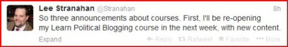 Yesterday the answer came to us: we’ll turn to blog favorite Sad Lee Stranahan! Who better to teach us how to blog about politics than a man who cut his teeth writing for Dead Breitbart’s Llama Masturbatorium and Semen Depository? By a huge coincidence Sad Lee was at that moment promoting his teaching skills on the Twitterz. Let’s see what the blogging master has to offer!