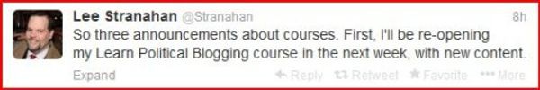Learn Political Blogging! That’s just what we want to do. Also, re-opening suggests he has offered this class before. So we searched Lee’s website and found a post from last March that informed us his class was now open, with a link to a site called LearnPoliticalBlogging.com. Promising! We checked out the site and found this: