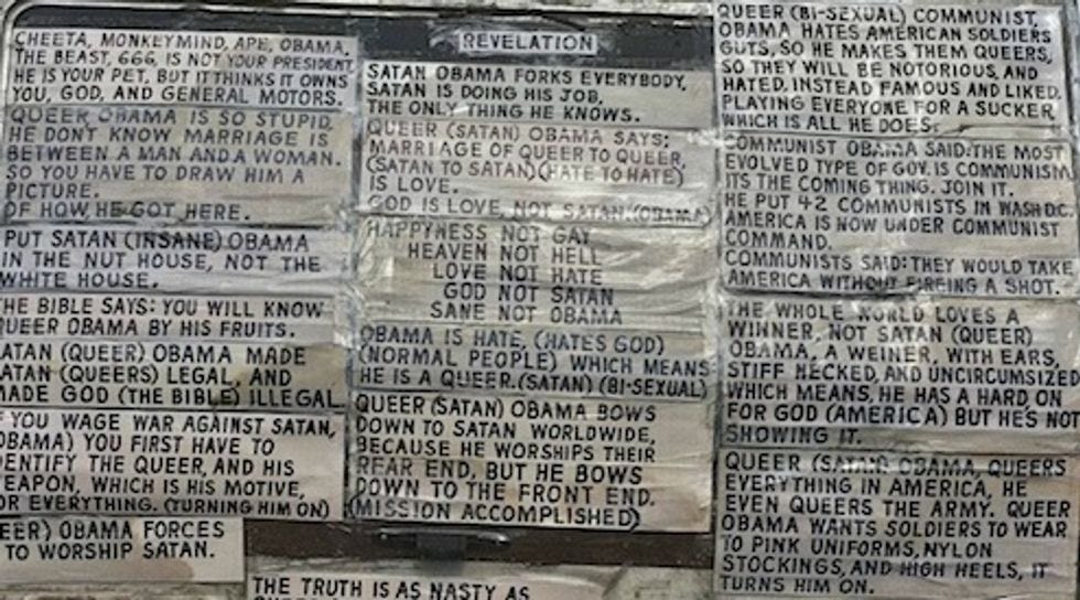 It is almost as if we are looking at a Teabagger brain scan, or "draft one" of Michele Bachmann's campaign tour bus, or the lyrics to a song Teabaggers use to sing to their children to sleep at night. There are some important questions, though. Why is most of it spelled correctly? Why is the handwriting so legible? Is Satan actually a bisexual? Why is it called even called "Revelation" when every wingnut already knows about all of these things?