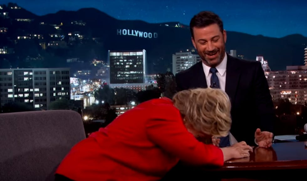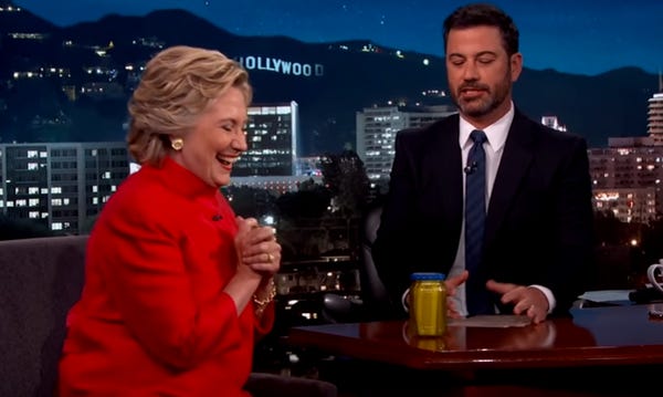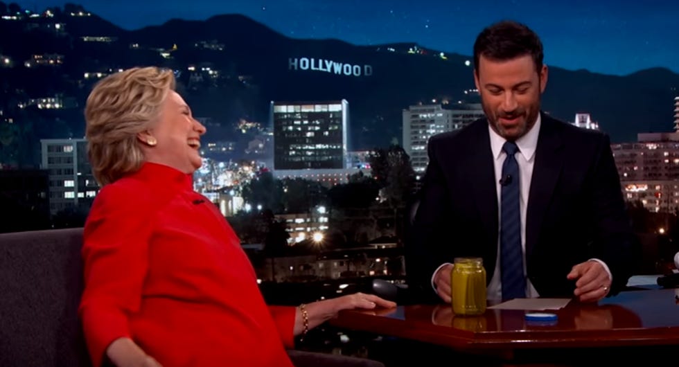 Monday night, Hillary Clinton went on the Jimmy Kimmel television program to say zingers and show off some new pantsuits, and during the interview, Kimmel brought up Hillary's ailing health, or rather, the right wing's obsession with her supposedly ailing health. He asked if she was currently dying, and instead of just answering the question, she answered, "Well, this has become one of their themes. Take my pulse while I'm talking to you." Jimmy responded, "There's nothing there!" Hillary continued: