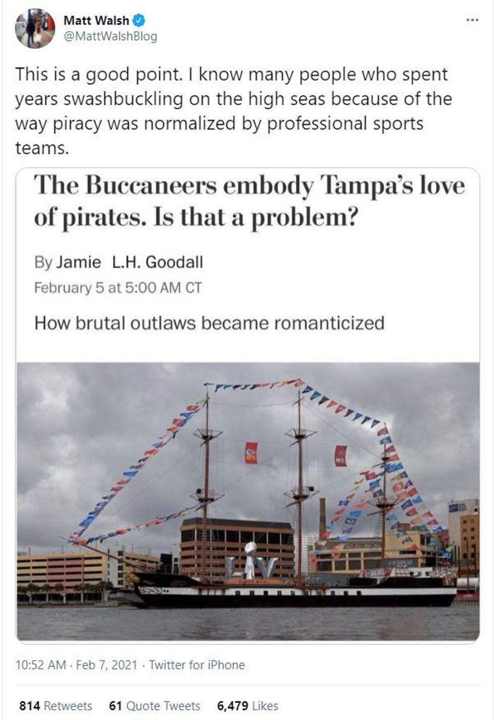 But oh dear, Goodall then had to go and talk about her expertise, musing that maybe there's something odd about celebrating a bunch of nautical murderers and thieves as romantic heroes, and before you could say " Ted Yoho and a bottle of rum," the word was out: A crazy Marxist historian lady was trying to cancel pirates, the Tampa Bay f'ball team, and sports fans, and just look how that crazy leftist was trying to do political correctness to the Super Bowl!