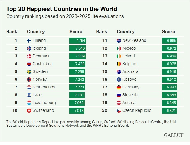 Top 20 Happiest Countries in the World. Guess who didn't make the list. Looks like a wish list we all may need to consider moving to.