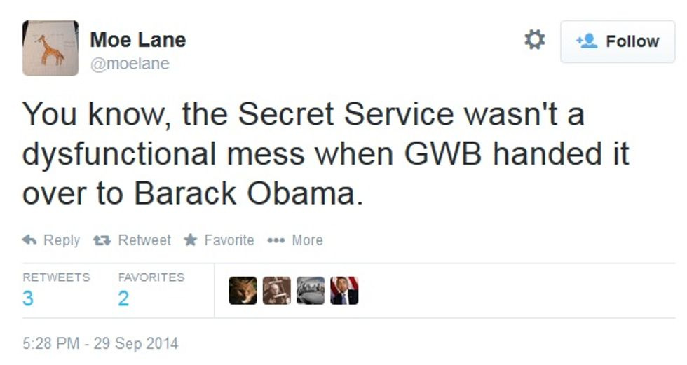 And finally, our winner of the Stupidest Goddamn Thing Said About This Sort Of Thing goes not to anyone at Breitbart or Daily Caller, but rather to Politico, which gave always credible serious journalist Ronald Kessler the chance to explain that the entire culture of the Secret Service is dysfunctional, and that Barack Obama is Not Helping by failing to fire Pierson two weeks ago already. And there's nothing at all bizarre about Kessler's conclusion, is there?