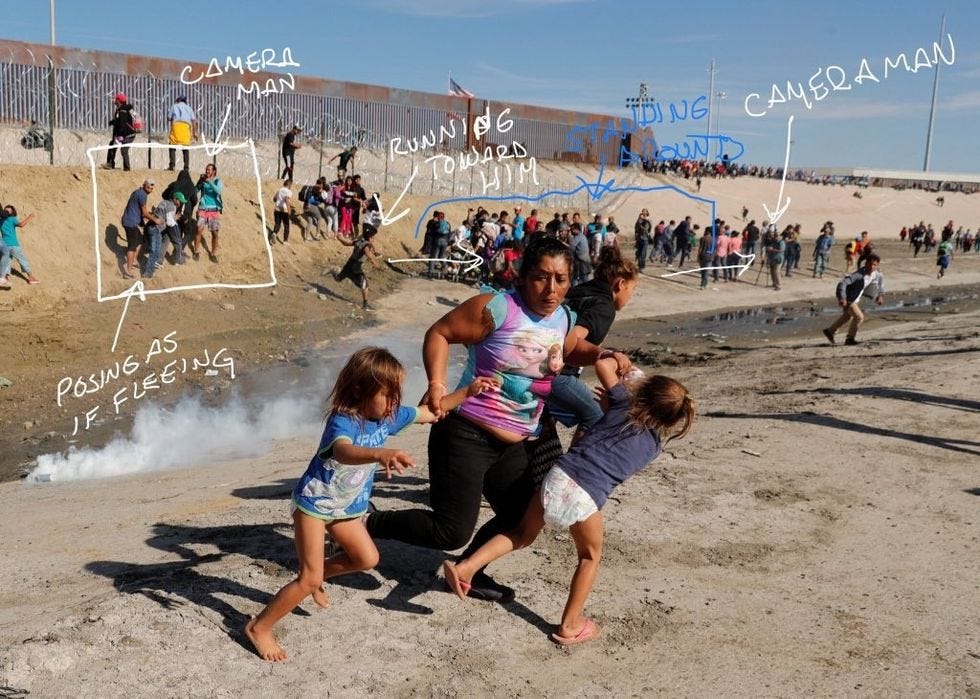 After further review, yesterday's 'horrific' picture of a woman with barefoot children running from the US border wall was a hoax. In the background of the picture a group of men are posing for one camera man and another is running towards another camera man. In other areas, people are just standing around. The woman with the children was just a photo-op