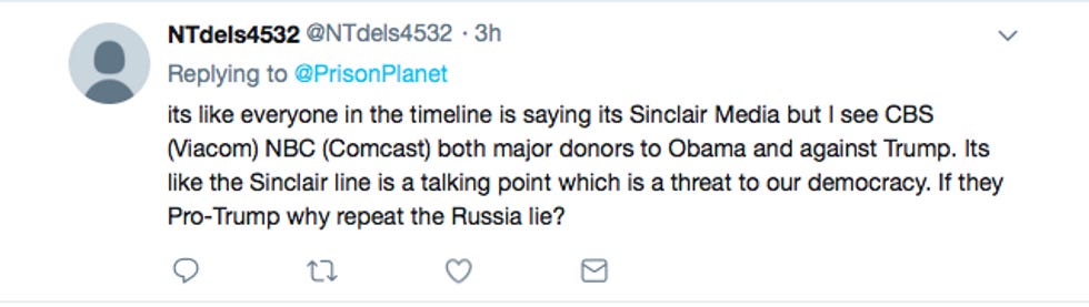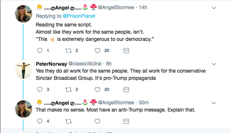 The amazing thing is that there are just as many people in the responses to Watson's tweet pointing out that Sinclair is a conservative company pushing conservative propaganda, and it does not sink in. In fact, many of them responded to this information by outright denying it.