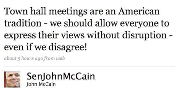 John McCain, who loves town halls so much that one time last summer he ORDERED Barack Obama to appear with him at 7,000 of them (and hopefully pay for them!), has "gone librul" again, now that his own party's official anti-health reform strategy is to piss all over his favorite "American tradition" throughout August with loud catcalls and armpit farts. Why is John McCain so condescending toward "people from small towns" and their Constitutional right to act retarded at civic functions? [ Twitter ]