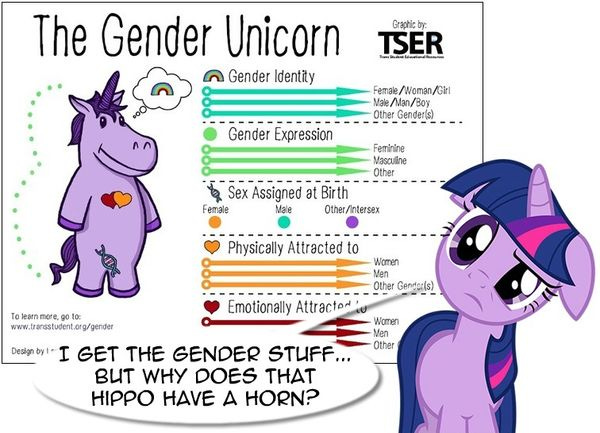 At the core of the furor is a little chart from a group called Trans Student Educational Resources (TSER), using a little purple "gender unicorn" to sort out some of the multiple ways in which we talk about gender identity. The chart appeared only as part of a presentation for teachers and staff, but since there's a cartoony unicorn on it, the Wingnuttosphere has been freaking out over what they assume is a freaky new mascot that will be in every classroom telling their precious children to go pee in the wrong restroom and buy a Subaru.