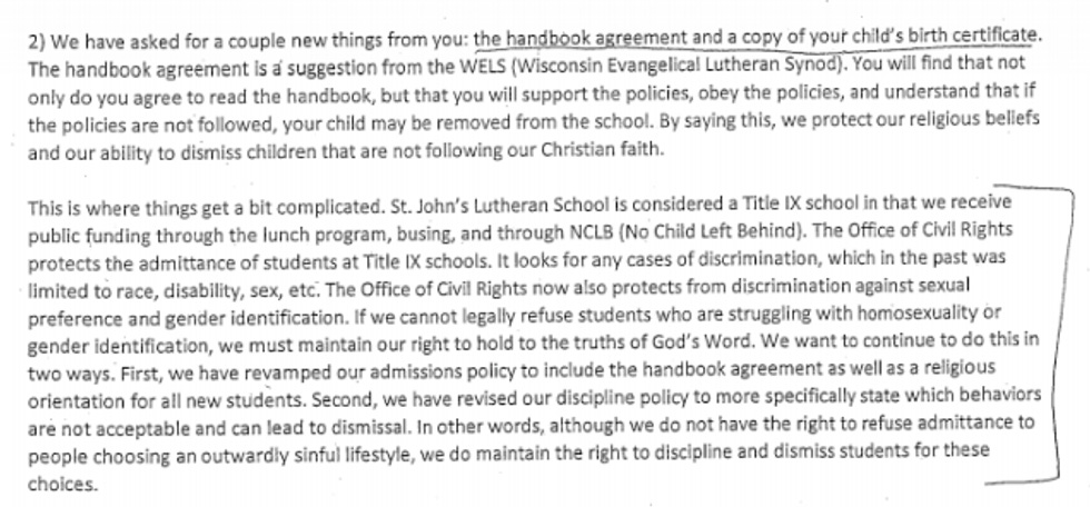 “If we cannot legally refuse students who are struggling with homosexuality or gender identification, we must maintain our right to hold to the truths of God’s Word,” St. John’s Principal Craig Breitkreutz wrote in a letter to parents this February. “In other words, although we do not have the right to refuse admittance to people choosing an outwardly sinful lifestyle, we do maintain the right to discipline and dismiss students for these choices."