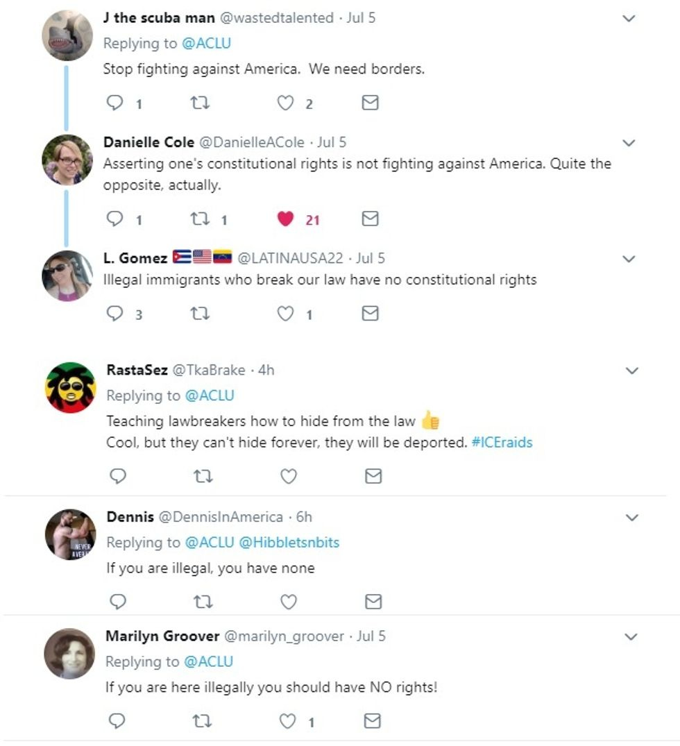 With mass arrests of immigrants apparently going forward this weekend, immigration rights groups are ramping up efforts to advise immigrant communities that they have legal rights and don't have to open the door to ICE unless the officers have a warrant from a judge. This really pisses off law-and-order types, because how can you have any order if people know their "rights" under the law? After all, "rights" are for people like national security advisers who weren't explicitly warned that lying to the FBI is a crime .