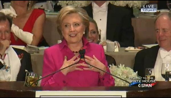 Donald Trump and Hillary Clinton traded barbs at the the 71st Alfred E. Smith Memorial Foundation Dinner, an annual fancy feast for presidential candidates and super-rich political and Jesus-types who can afford expensive suits and long white gloves. Trump dug his grave just a bit deeper when he stopped telling jokes and went straight to calling Clinton corrupt. Haha! (The joke is that she's corrupt! ) ( Video )