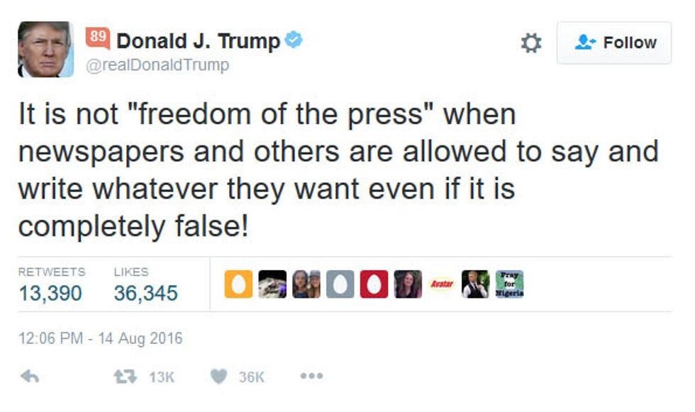 Trump weighed in on the Tweet machine to remind us he is A Idiot and literally doesn't understand the First Amendment.