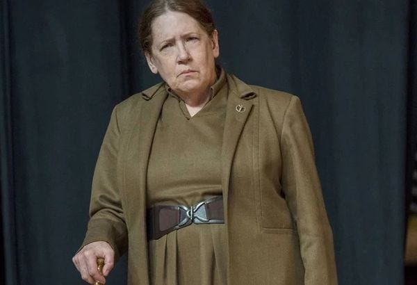 Lydia grows into a fully realized, complex villain in The Testaments; her voice is wonderfully Machiavellian. We learn she was a family court judge in the Before Times, and that once everything went to shit and she found herself still alive, she decided to make the most of the very limited options for survival left to her. As God is her witness, she'll never be powerless again. And since she remains certain the new rulers of Gilead really worship raw power, that's the only god whose morality she intends to obey.