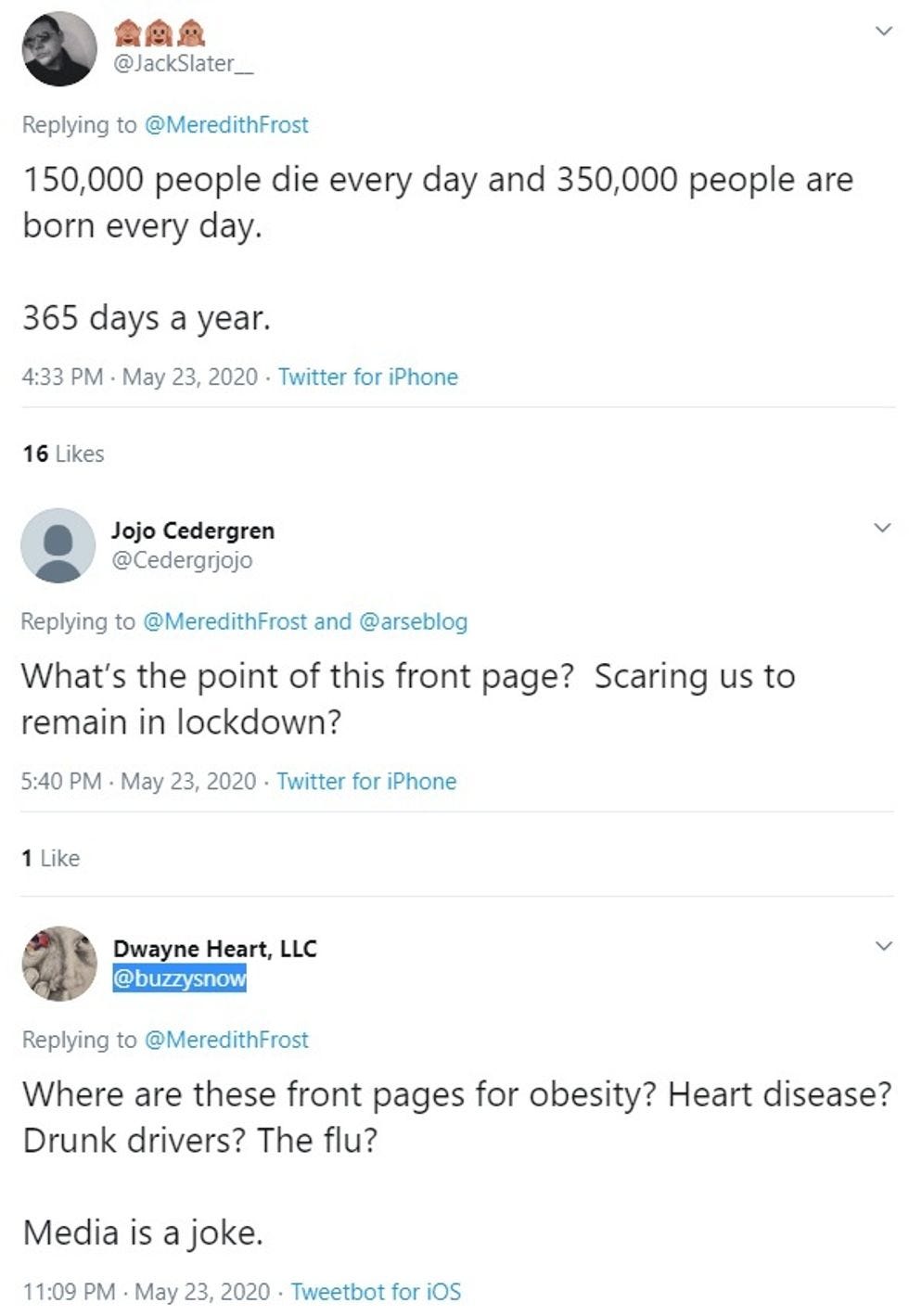 There's also been a bit of rightwing crowing over an error in the front page list, which mistakenly included a murder victim, so perhaps the pandemic isn't real. And others just said hurr-hurr, you said the losses are "incalculable" but you put a number on it, hurr.