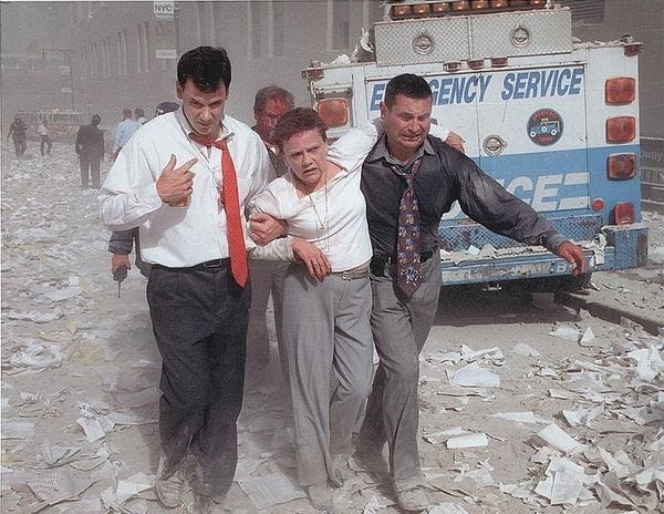 The helpers weren't only in the towers; in the streets nearby, people did what they could to get each other to safety, proving the ideology of individualism a lie, over and over.