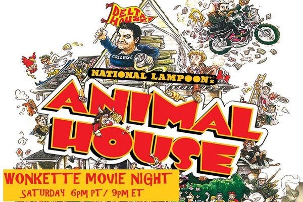 Wonkette Movie Night: Animal House!Come watch!Robyn PennacchiaNov 13, 20224,270ShareAnimal House is available for free on Peacock with a subscription or trial and for $3.99 on Amazon, Vudu, etc.!Enjoy!Want to just donate once?PreviousNext
