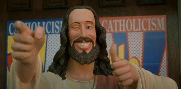 I'm sure you've seen this dude a million times, in the movie it is used as a way to get people excited by Catholicism again, to draw them in with a less somber image of the crucified son of god. Buddy Christ is the mascot for Catholicism Wow! which allows for a jumping point in the film, as the change is celebrated at a church that is to be rededicated. That rededication presents a loophole called “plenary indulgence” or a Catholic Get Out of Jail Free card for two fallen angels to re-enter Heaven.