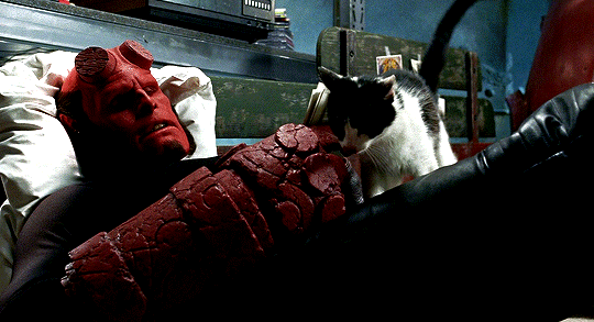 Superman has a dog and Hellboy is a cat person. It has been suggested by some fans that Hellboy loves cats because one of the first things that he sees is a cat figurine after being dragged through the portal and landing in the ruins of a church. Or it could just be that cats are amazing.