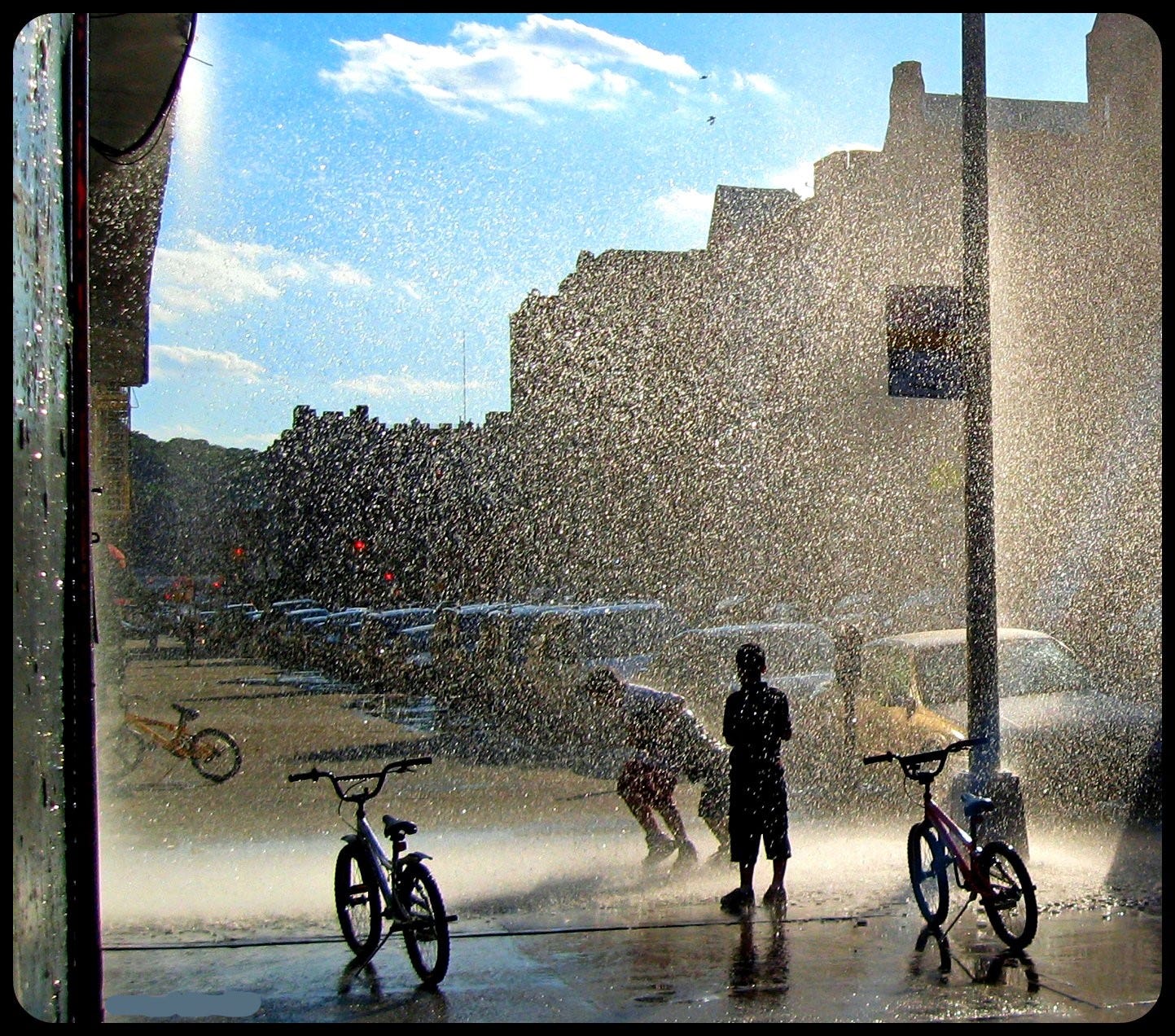 It is a hot summer in the city, windows are open and curtains are pulled back to allow for the slightest breeze. The children run to catch a spray of water from a street cleaning truck. Kids in New York City still go looking for a cool down in the street from fire hydrants in a similar way.