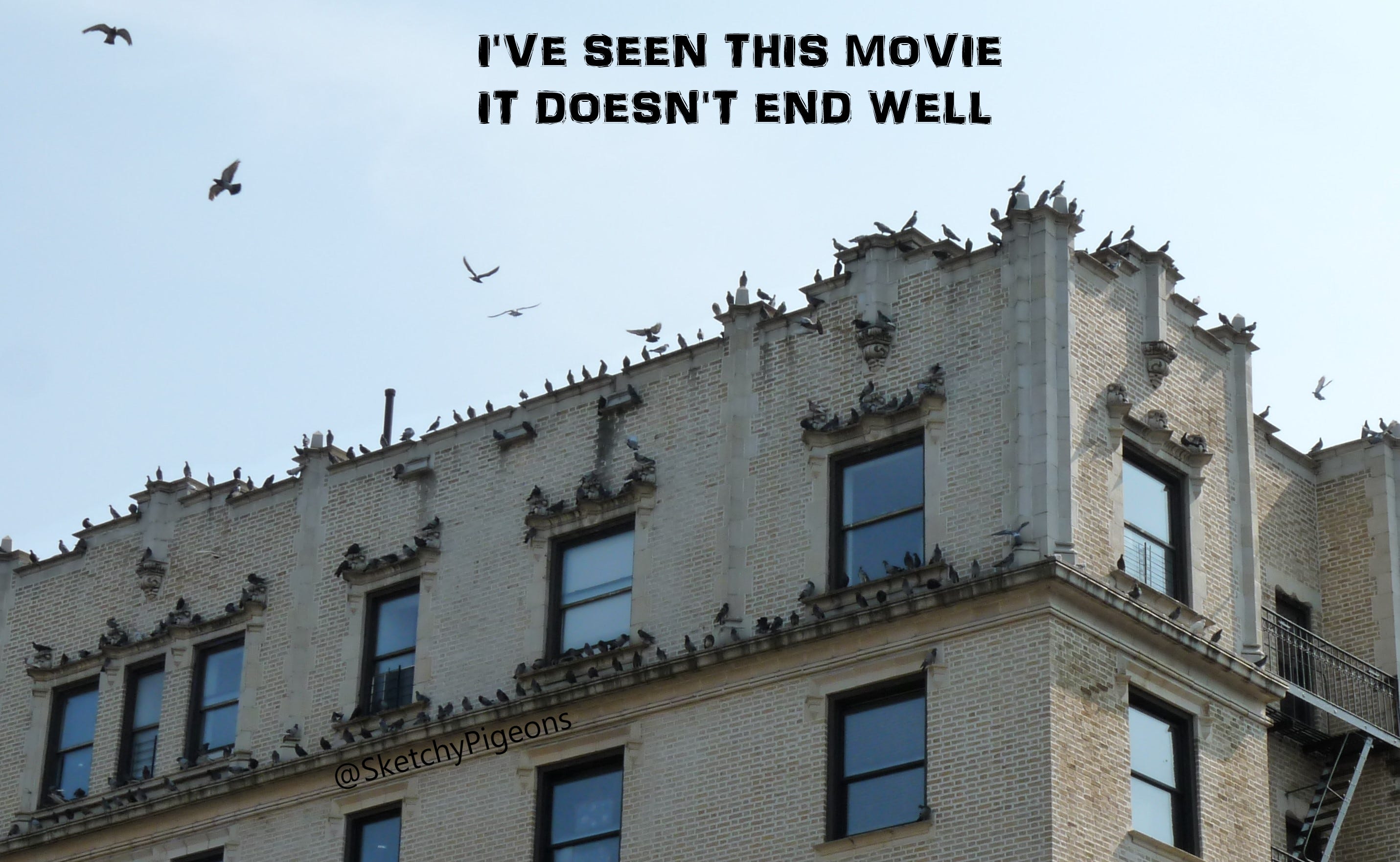 A large flock of birds perched in one place tends to creep people out. I have noticed this with pigeons in my Washington Heights neighborhood and my first thought is always The Birds. Many of us watched this ornithological opus when we were too young to be viewing something so frightening and intense. And I doubt I am not the only one it scared shitless while at the same time helping to foster a love for scary movies. Sorry, I egret the use of fowl language.