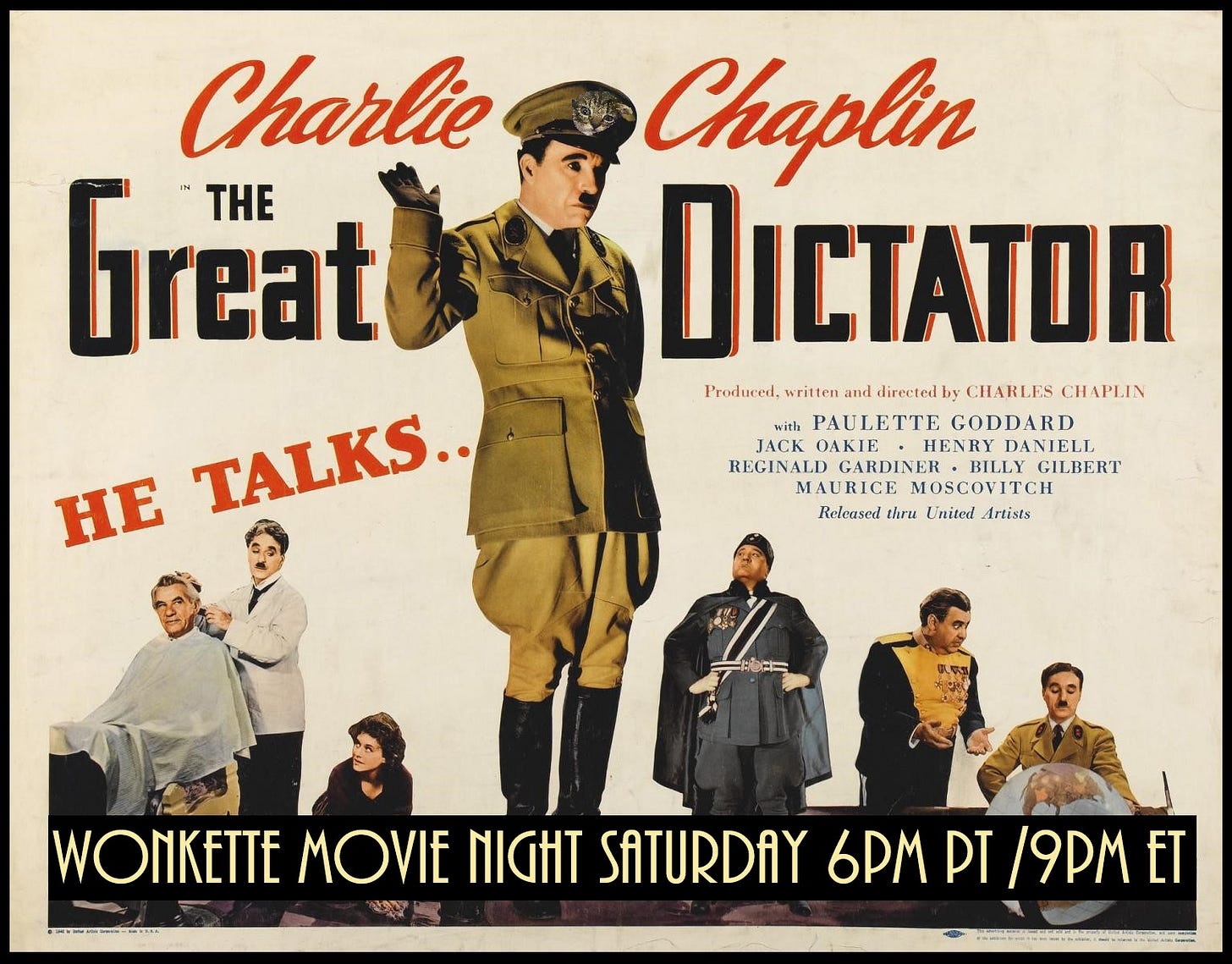 The Great Dictator stars Charlie Chaplin, Paulette Goddard, Jack Oakie, Carter DeHaven, Henry Daniell and Reginald Gardiner. Directed by Charlie Chaplin.
