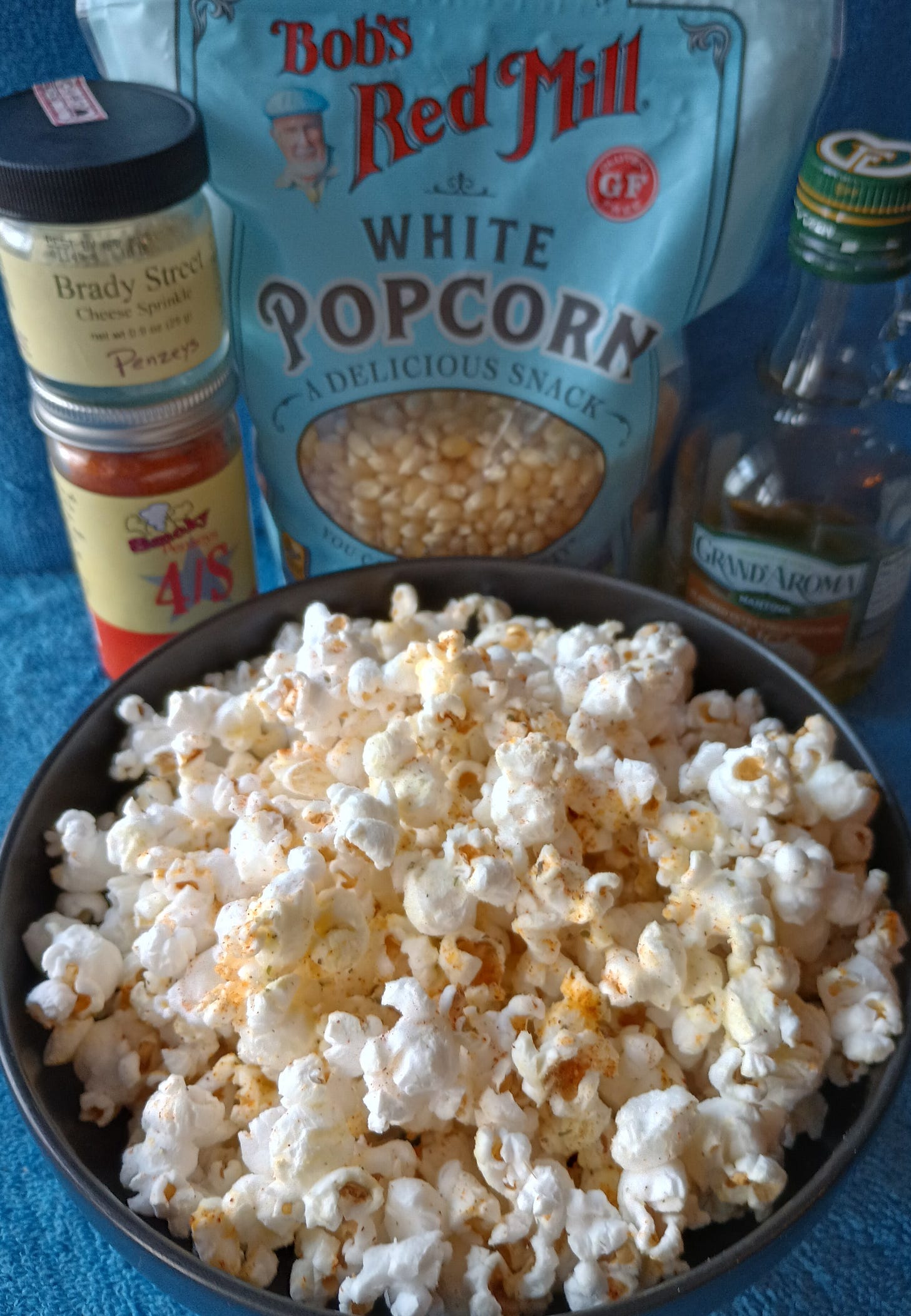 Popcorn and movies, perfect companions. Everyone knows that I always finish mine before the movie starts. I like trying different flavors, here’s my recommendation for tonight, it reminds me of garlic bread. I start with Bob’s Red Mill kernels, cooked in peanut oil, then tossed with garlic flavored olive oil. Season with Penzeys Brady Street cheese sprinkles and a bit of smoky seasoned salt. And don’t even try to save it for the movie, dig in!