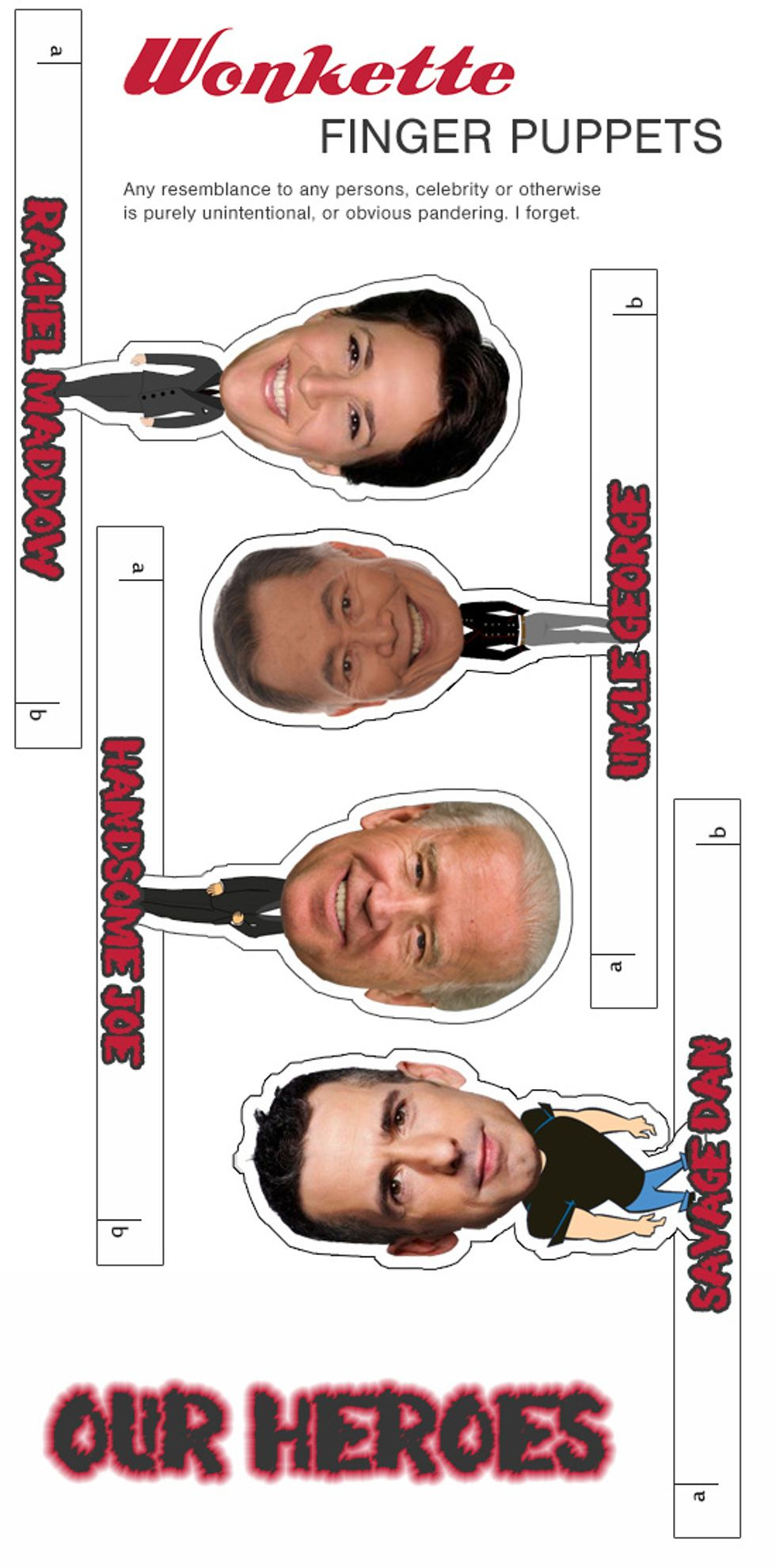 And so, thanks to Wonket Web Mage Shypixel, who unlike Yr Dok Zoom is actually GOOD at Photoshop, we are pleased to bring you these very cool, very official-looking Wonkette finger puppets (all celebrity images purely for parodic purposes, not for commercial use, and please, no wagering). We've got two sets so far, and prolly more on the way! Print! Snip! Enjoy!