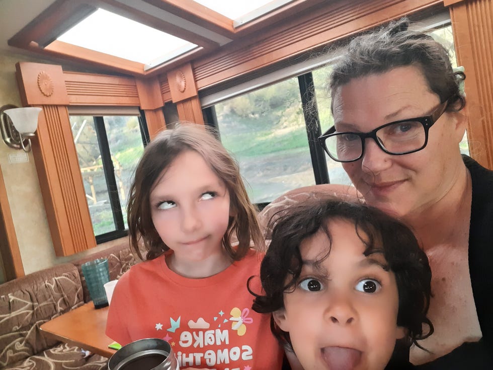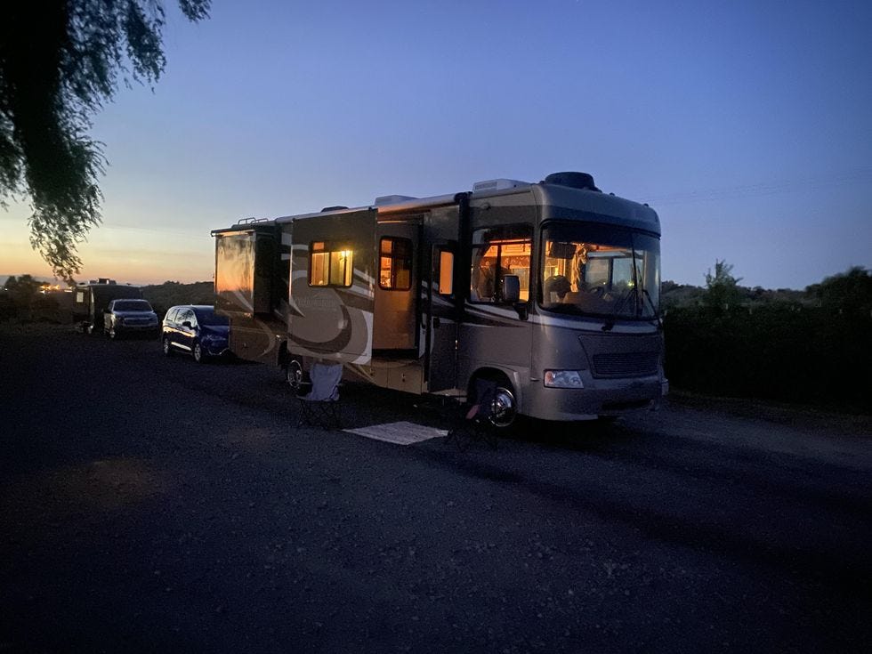 See that Wonkebago II up there? We are selling it, because we are sick of RVing, and you get first dibs. It's a 2009 Gulf Stream Yellowstone special "Atrium" edition with low miles in excellent condition except that the pleather on the captain's chairs (which turn around!) is flaking. It's got a queen bed, three sliders, it opens up bigger than your goddamn apartment, it gets shitty mileage obvs (is gas, not diesel). Email me at rebecca at wonkette dot com and say Rebecca, I will give you fifty THOUSAND dollars. We have legs for the stupid couch currently sitting on the floor in the picture above because the jerks at the RV fixing store didn't install it, but we will install it.