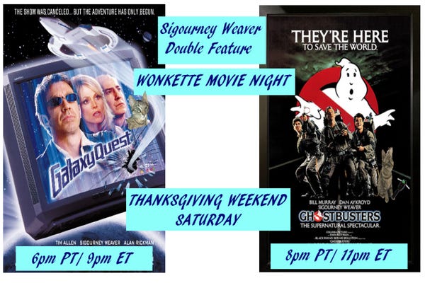 Achtung achtung, Ziggy informs me you are having a DOUBLE FEATURE! You will be watching together Galaxy Quest, at 9 p.m. Eastern and 6 p.m. Pacific! Then apparently some of you will still be awake (???) to watch Ghostbusters at 11! PM! Eastern!!!
